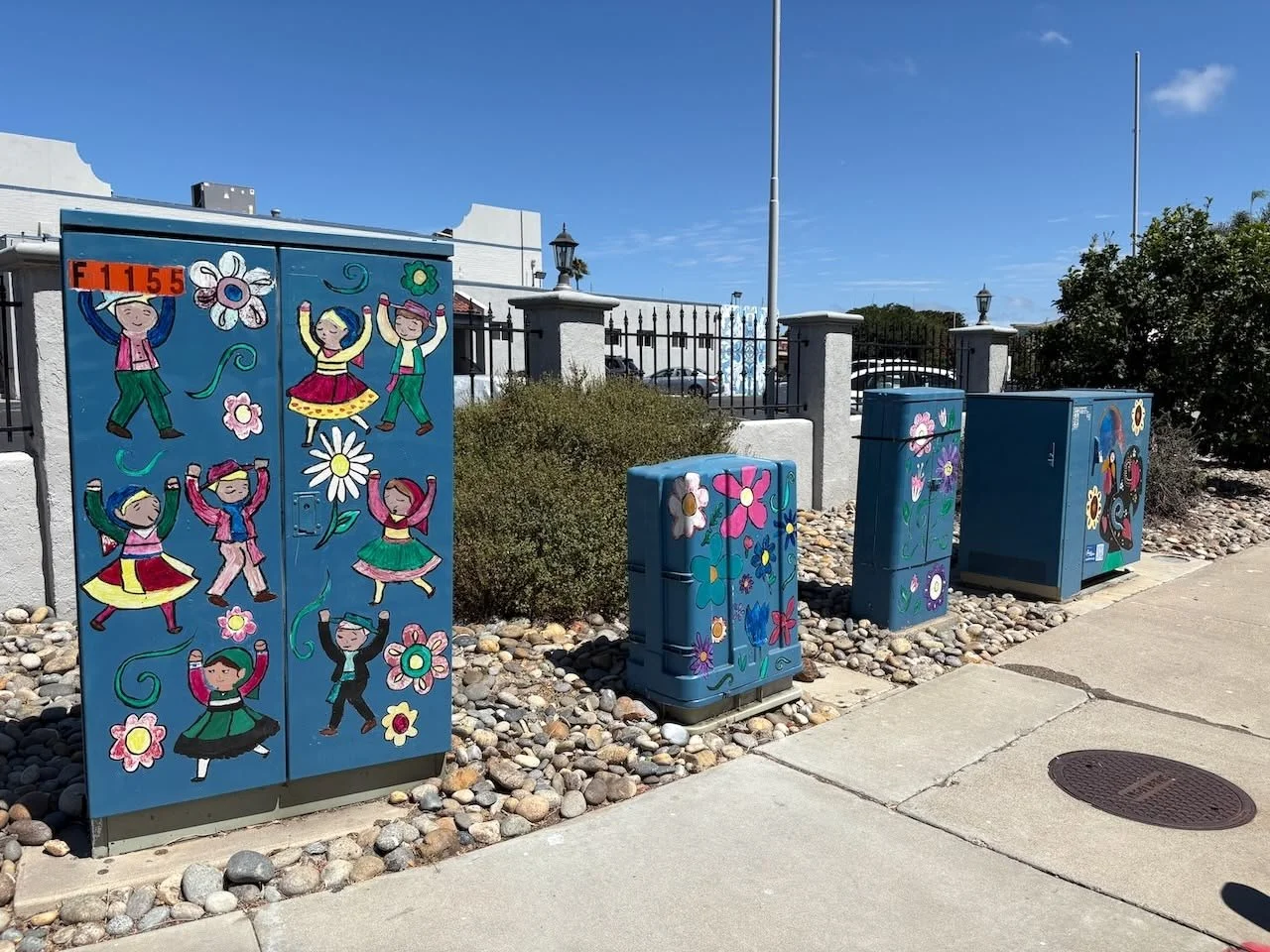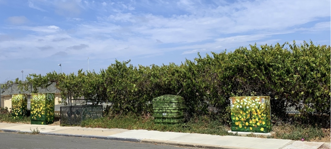 Artist Linda Churchill’s beautification of four utility boxes on Evergreen near Cabrillo Elementary school blends with the landscape perfectly. The bright flowers look like living plants, and the camouflage colors on the middle box almost make it disappear!